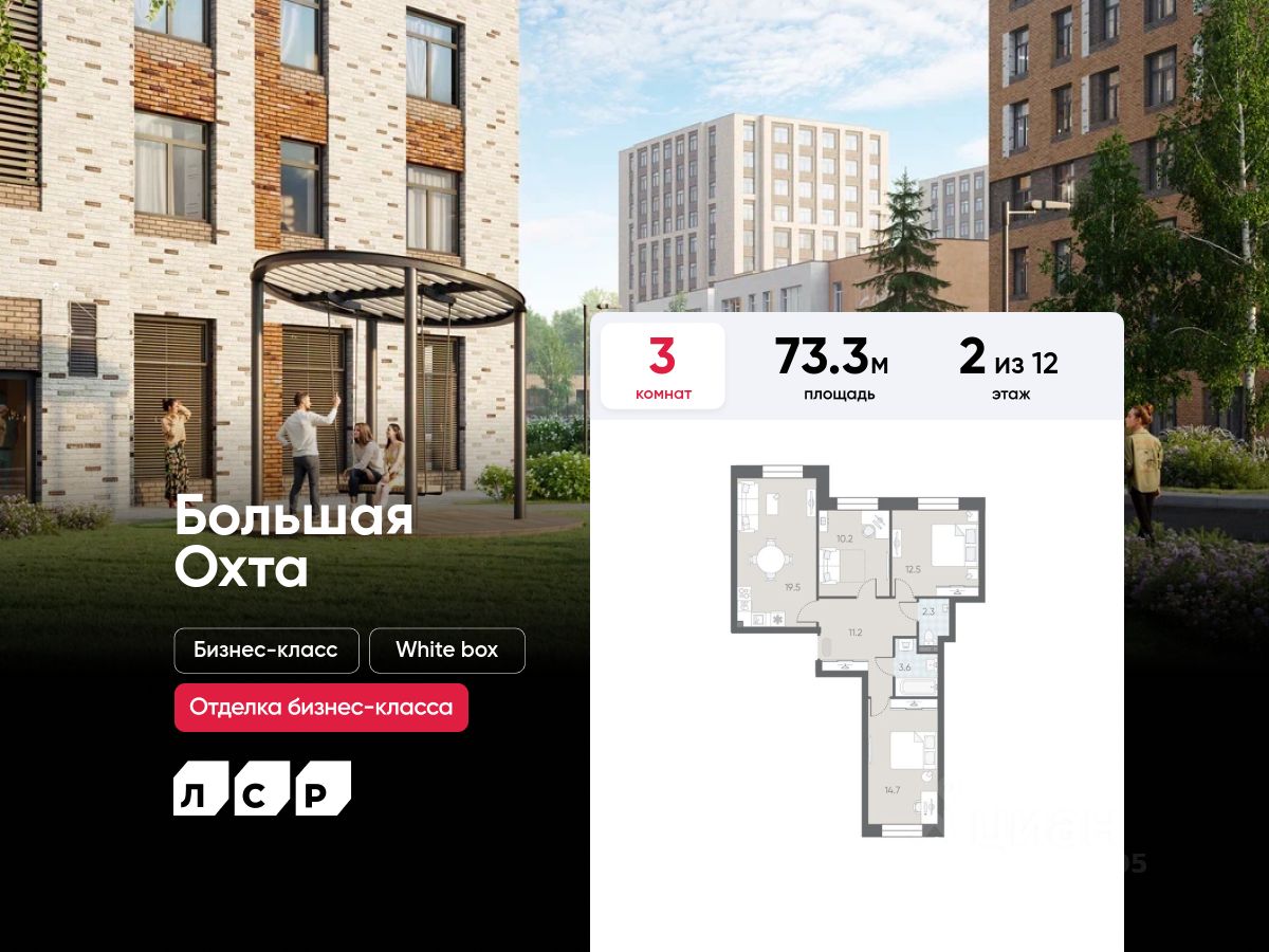 Продаётся 3-комнатная квартира в ЖК "Большая Охта" на 2 этаже. Общая площадь составляет 73.30 кв. м. Квартира с white box отделкой. Жилой комплекс "Большая Охта" располагается по адресу Санкт-Петербург, Красногвардейский.