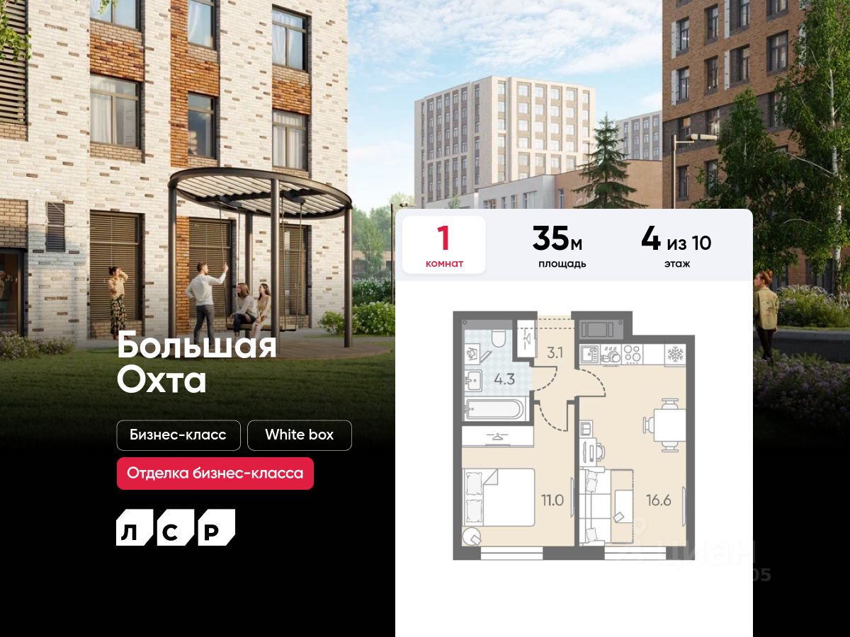 Продаётся 1-комнатная квартира в ЖК "Большая Охта" на 4 этаже. Общая площадь составляет 35.00 кв. м. Квартира с white box отделкой. Жилой комплекс "Большая Охта" располагается по адресу Санкт-Петербург, Красногвардейский.