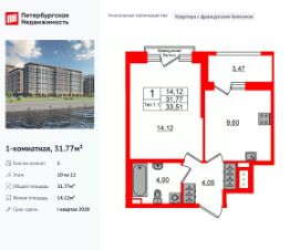 Уникальная планировка, кухня 9.6 м², вместительная прихожая 4.05 м². Общая площадь квартиры - 31.77 м², жилая 14.12 м², высота потолка 2.77 м.