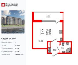 Удобная, классическая, функциональная европланировка, вместительная прихожая 3.02 м². Общая площадь студии - 24.87 м², жилая 18.53 м², высота потолка 2.77 м.