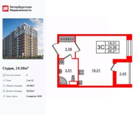 Удобная, классическая, функциональная европланировка, вместительная прихожая 3.06 м². Общая площадь студии - 24.98 м², жилая 18.01 м², высота потолка 2.77 м.