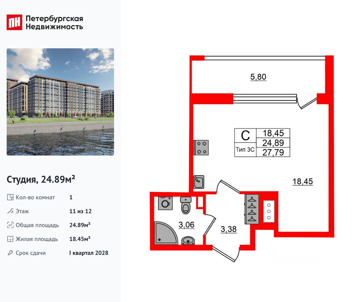 Удобная, классическая, функциональная европланировка, просторная прихожая 3.38 м². Общая площадь студии - 24.89 м², жилая 18.45 м², высота потолка 2.77 м.