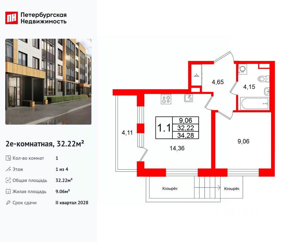 Удобная, классическая, функциональная европланировка, большая кухня-гостиная 14.36 м², просторная прихожая 4.65 м². Общая площадь квартиры - 32.22 м², жилая 9.06 м², высота потолка 2.77 м.