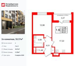 Удобная, классическая, функциональная европланировка, большая кухня-гостиная 17.22 м², вместительная прихожая 4.01 м². Общая площадь квартиры - 38.37 м², жилая 12.06 м², высота потолка 2.77 м.