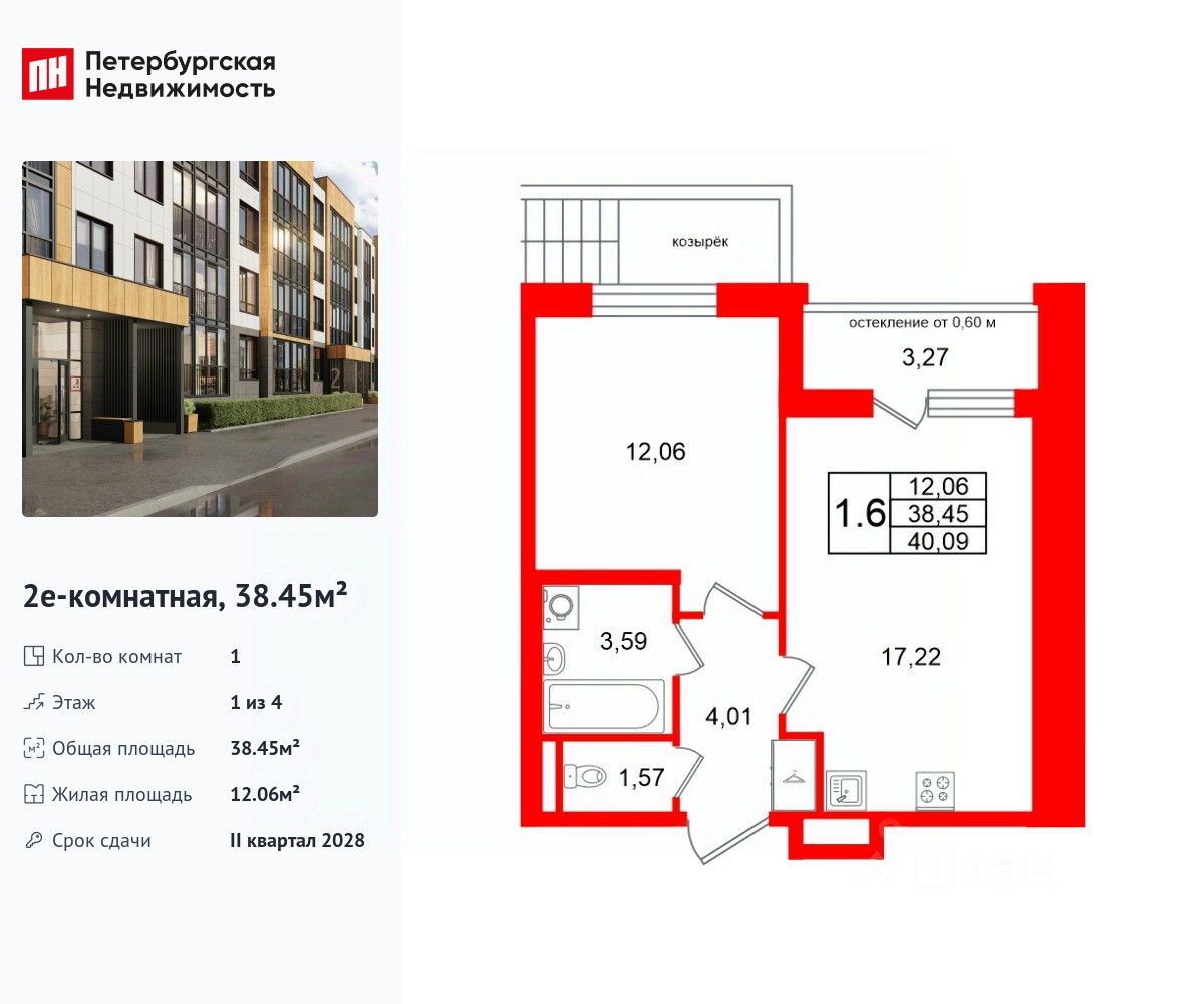Удобная, классическая, функциональная европланировка, большая кухня-гостиная 17.22 м², вместительная прихожая 4.01 м². Общая площадь квартиры - 38.45 м², жилая 12.06 м², высота потолка 2.77 м.