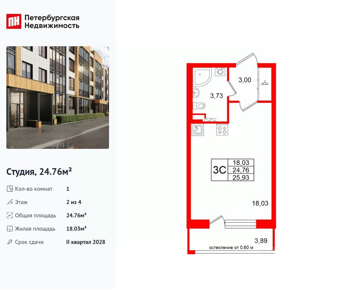 Удобная, классическая, функциональная европланировка, вместительная прихожая 3 м². Общая площадь студии - 24.76 м², жилая 18.03 м², высота потолка 2.77 м.