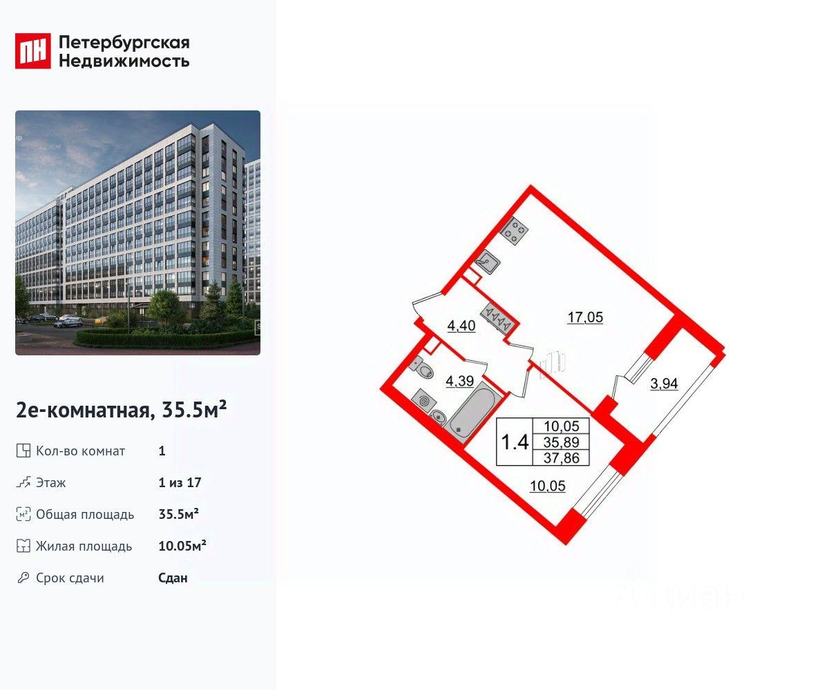 Удобная, классическая, функциональная европланировка, большая кухня-гостиная 17.05 м², просторная прихожая 4.4 м². Общая площадь квартиры - 35.5 м², жилая 10.05 м², высота потолка 2.77 м.