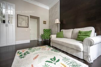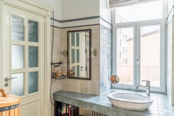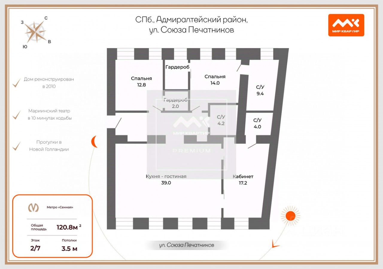 Общая площадь квартиры составляет 120,8 кв. м, а высокие потолки в 3,5 метра (эксклюзивно для этого этажа) придают интерьеру ощущение простора и свободы.