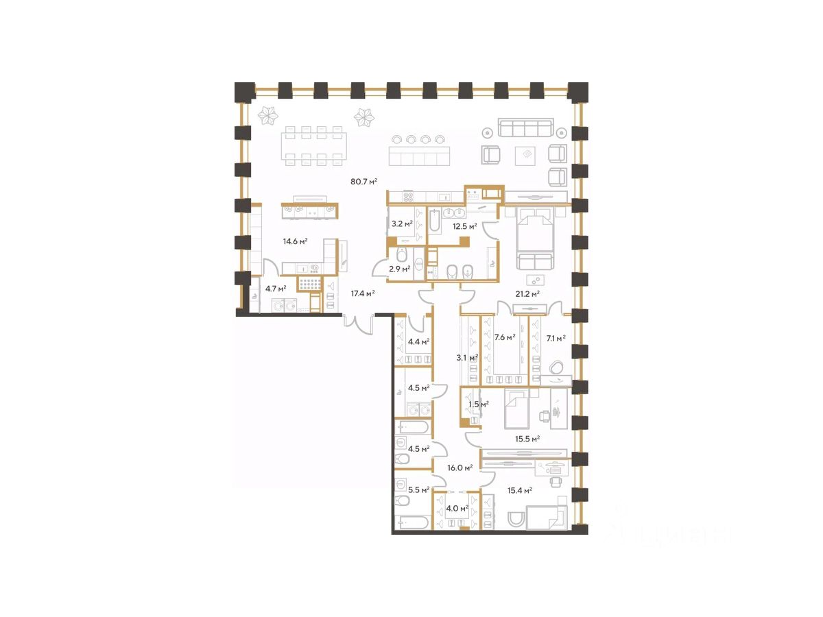 Планировочные решения жилого комплекса уникальны здесь есть квартиры с голливудскими гостиными и коктейльными корнерами, с анфиладными мастер-спальнями и просторными гардеробными, кухнями-гостиными и прачечными.