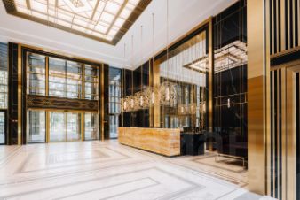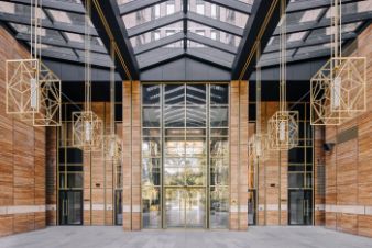 ЖК "Институтский, 16" построен в стиле ар-деко. Фасады украшают анималистические панно, золотые вставки и зеркальные фрагменты, используется панорамное остекление. Входная группа выполнена в натуральных материалах и цветах чёрном мраморе, травертине, ониксе.