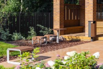 Территория дома закрыта от посторонних и машин. Внутреннее пространство двора зонировано с помощью растений и построек.