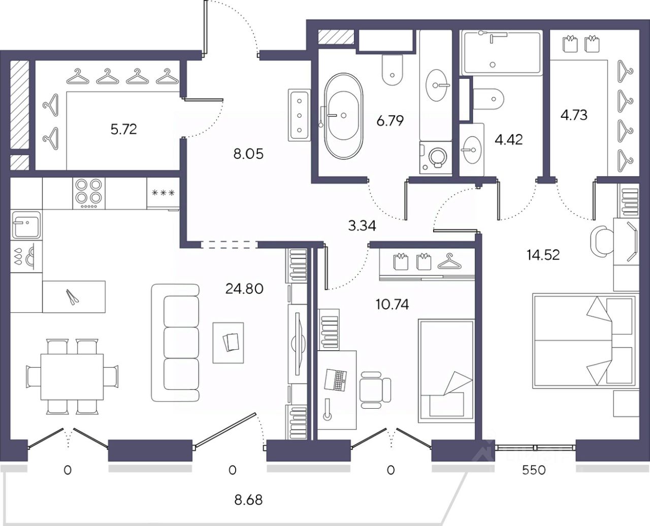 2-комн. квартира с предчистовой отделкой в ЖК "Большой, 67" на 8 этаже. Общая площадь: 83.9 кв.м., жилая: 25.26 кв.м., площадь просторной кухни-столовой: 24.8 кв.м. Комнаты изолированные, все окна выходят на одну сторону. В квартире один балкон, два совмещенных санузла. Наличие террасы в квартире открывает возможность для обустройства дополнительной площади. Высота потолков 2.98 м.