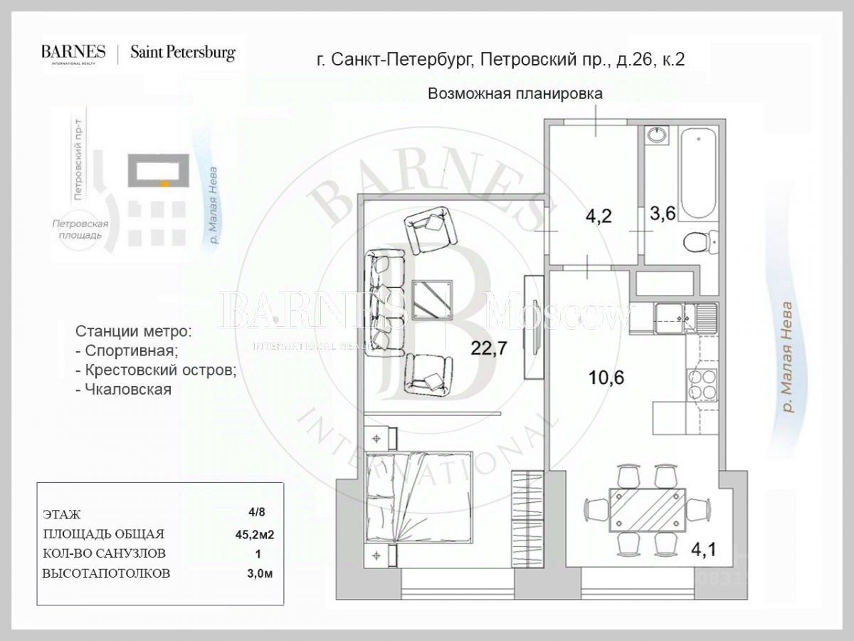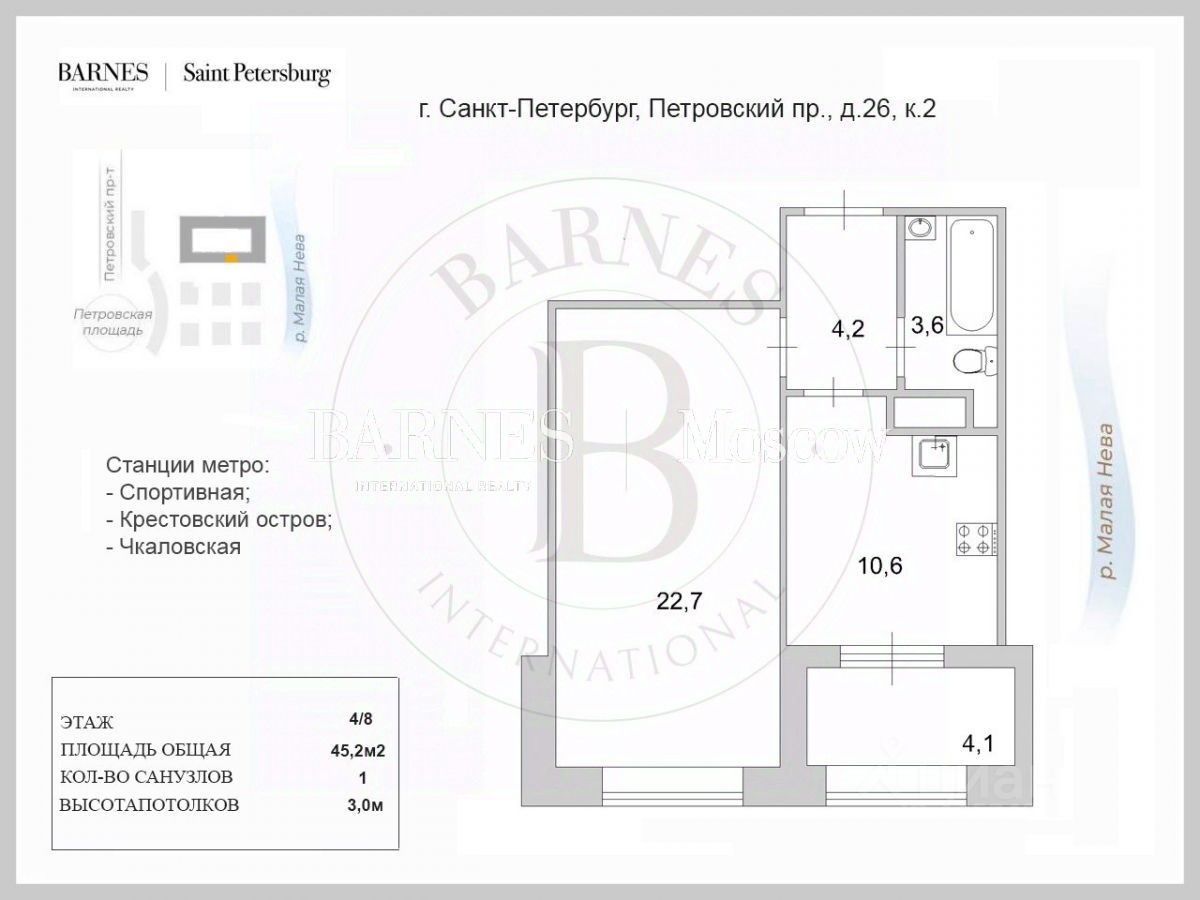 Крестовский остров — около 10 минут пешком, центр Петроградской стороны — 5 минут.