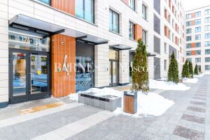 Дом выделяется выразительной архитектурой: фасады облицованы натуральным камнем и керамогранитом, входные группы — современные, с автоматическими дверьми. Зона ресепшен с круглосуточным консьержем и общественная зона с панорамными витражными окнами и художественной подсветкой.