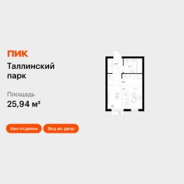 Продаётся квартира-студия площадью 25,94 кв.м на 10 этаже 12 этажного дома (Корпус 4.1, Секция 1) проекта ПИК Таллинский парк. Светлый просторный подъезд на уровне земли, функциональная планировка, большие окна, без отделки.