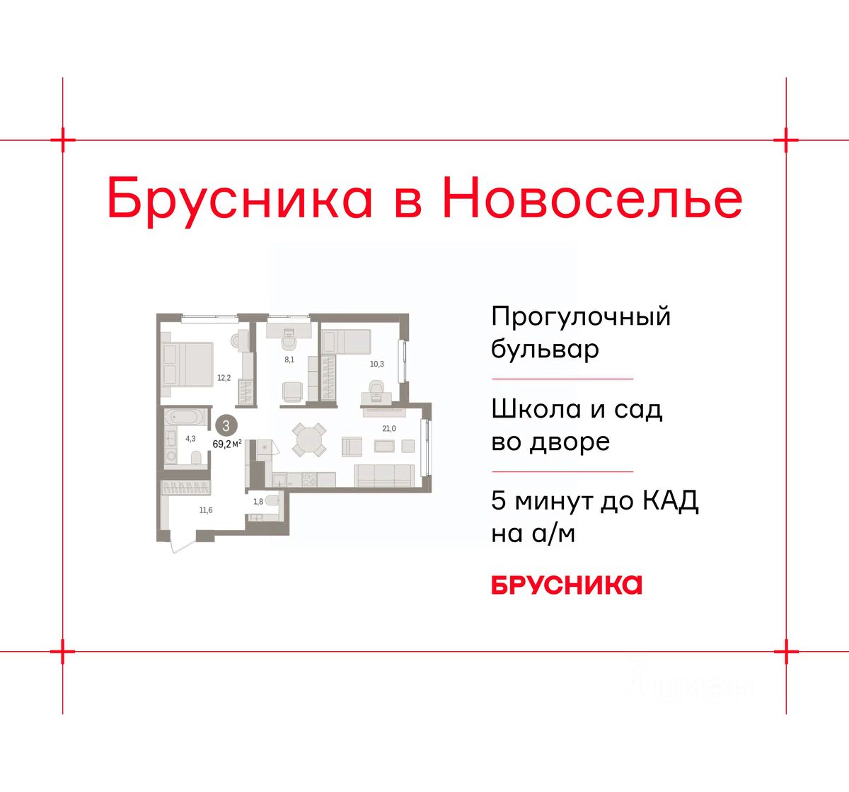 Просторная трехкомнатная квартира с предчистовой отделкой в ЖК "Брусника в Новоселье" на 3 этаже. Общая площадь: 69.22 кв.м. Высота потолков 2.7 м.
