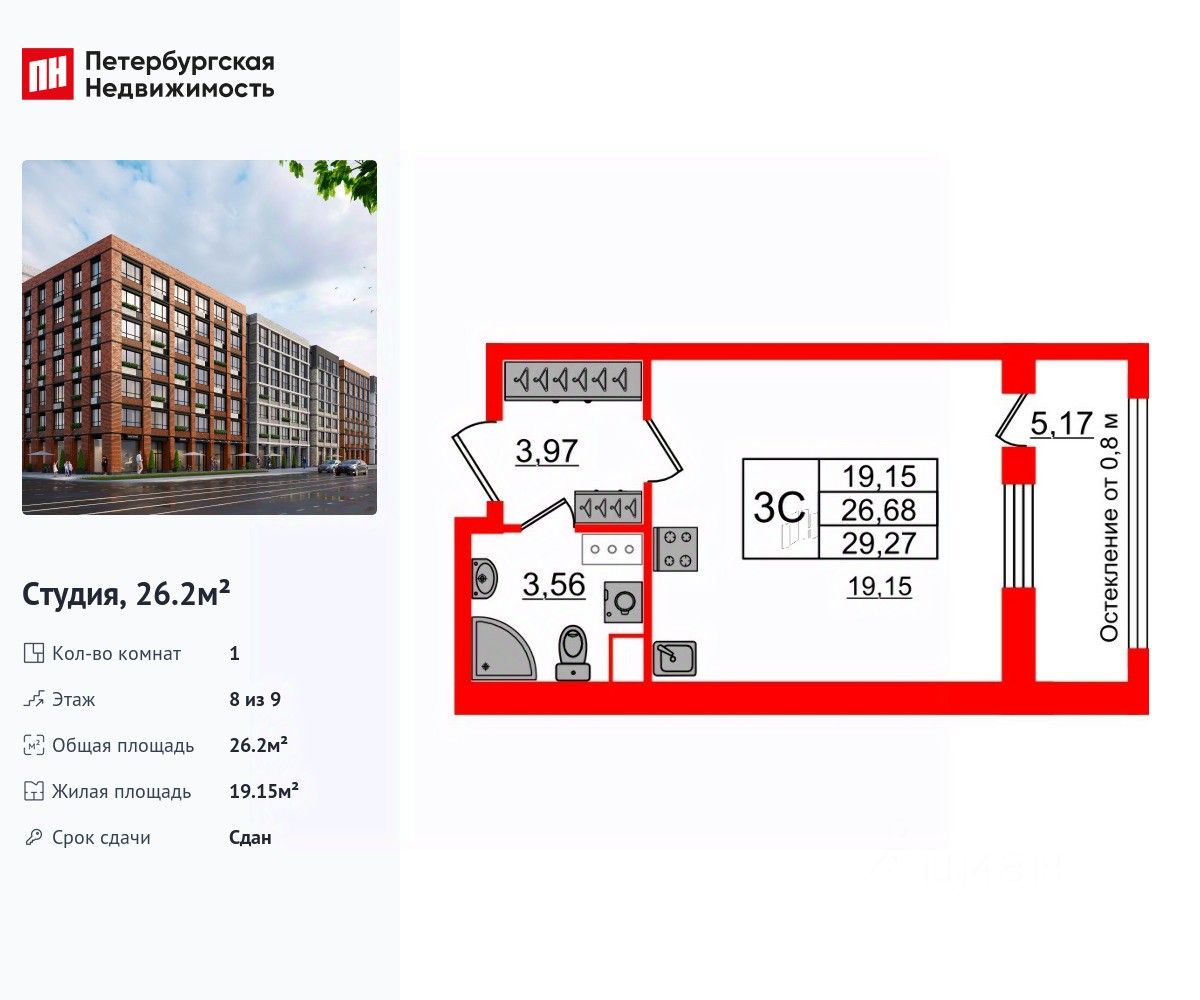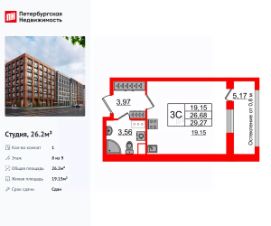 Удобная, классическая, функциональная европланировка, просторная прихожая 3.97 м². Общая площадь студии - 26.2 м², жилая 19.15 м², высота потолка 2.75 м.