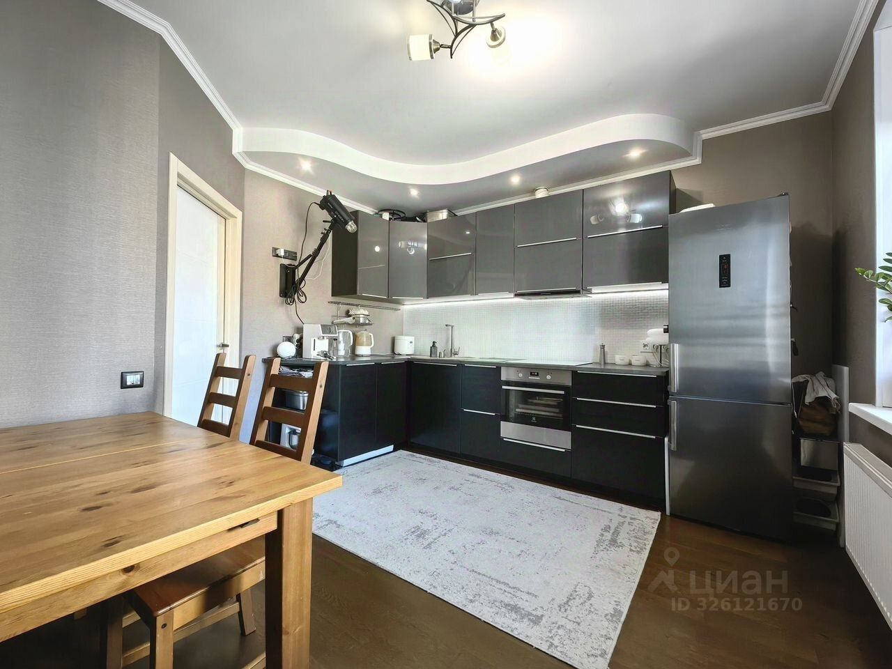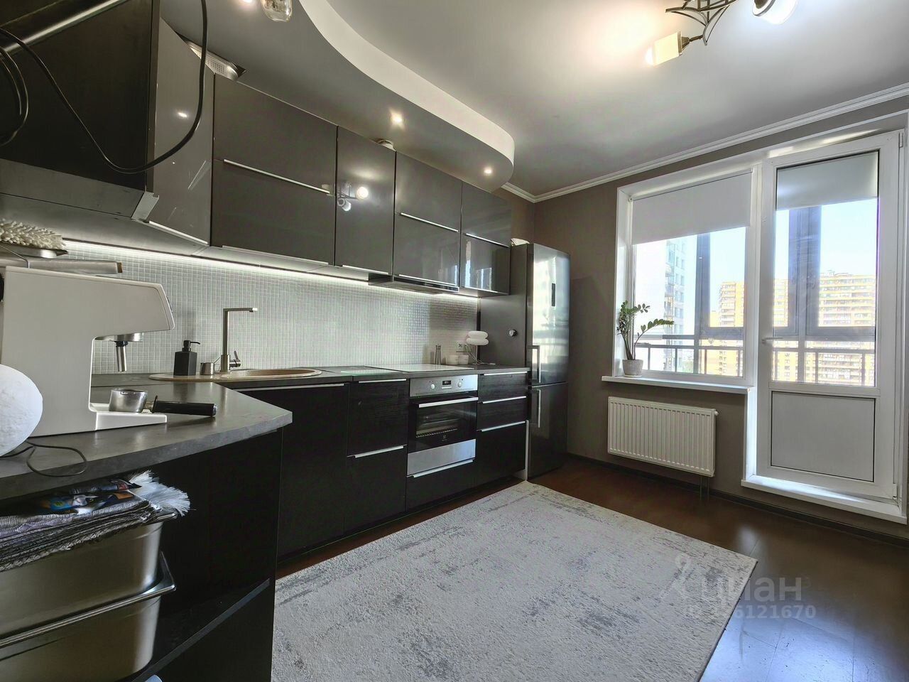 Выполнена качественная чистовая отделка. Установлен большой кухонный гарнитур со встроенной техникой: духовой шкаф Electrolux, варочная панель, вытяжка Kuppersberg. Холодильник Hotpoint-Ariston. В санузлах смонтирован теплый пол. На лоджии на полу уложен керамогранит. Установлены хорошие межкомнатные двери, надёжная сантехника, установлена полноценная ванна 170 см.