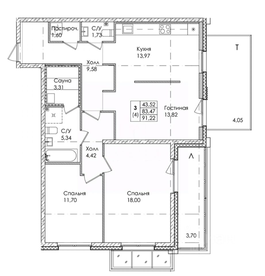 Общая площадь квартиры с учетом террасы составляет 91,22 м², из которых 43,52 м² — жилая площадь. Кухня занимает 13,97 м². Окна выходят на улицу и во двор, а угловое расположение квартиры обеспечивает хорошую освещённость и тепло. В квартире предусмотрено размещение сауны, а также есть отдельная комната для постирочной или гардеробной.
