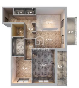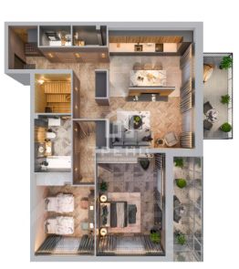Квартира расположена на первом этаже четырёхэтажного кирпично-монолитного дома. Высота потолков — 3 метра, что создаёт ощущение простора и свободы. В квартире три изолированные комнаты и три санузла: два раздельных и один совмещенный с сауной. Также есть застекленная лоджия и просторная терраса, где можно наслаждаться видом на улицу.