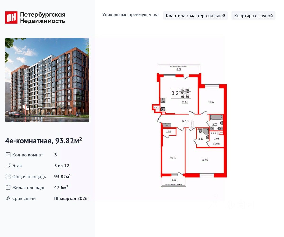 Уникальная, функциональная европланировка, большая кухня-гостиная 23.61 м², вместительная прихожая 10.47 м². Общая площадь квартиры - 93.82 м², жилая 47.6 м², высота потолка 2.77 м.