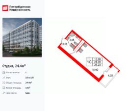 Удобная, классическая, функциональная европланировка, вместительная прихожая 3.04 м². Общая площадь студии - 24.4 м², жилая 18 м², высота потолка 2.77 м.