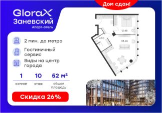 Продается 1-комн. апартамент на 10-м этаже в сданном Апарт-комплексе бизнес-класса "GloraX Заневский". Ключи сразу! Общая площадь лота составляет 51,64 кв. м, из которых 12,48 кв. м отведено под жилую. Номер апартамента - 1 036.