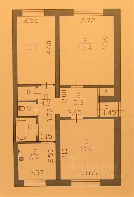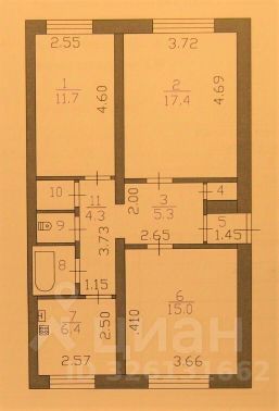 Изолированные комнаты - 17,4 кв.м, 15 кв.м, 11,7 кв.м.