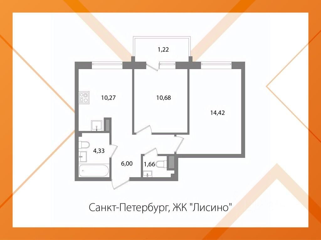 - Общая площадь квартиры 48,58 м2. Изолированные комнаты 14,42 + 10,68 м 2 (с выходом на балкон). 2 санузла 4,33 и 1,66 м2.