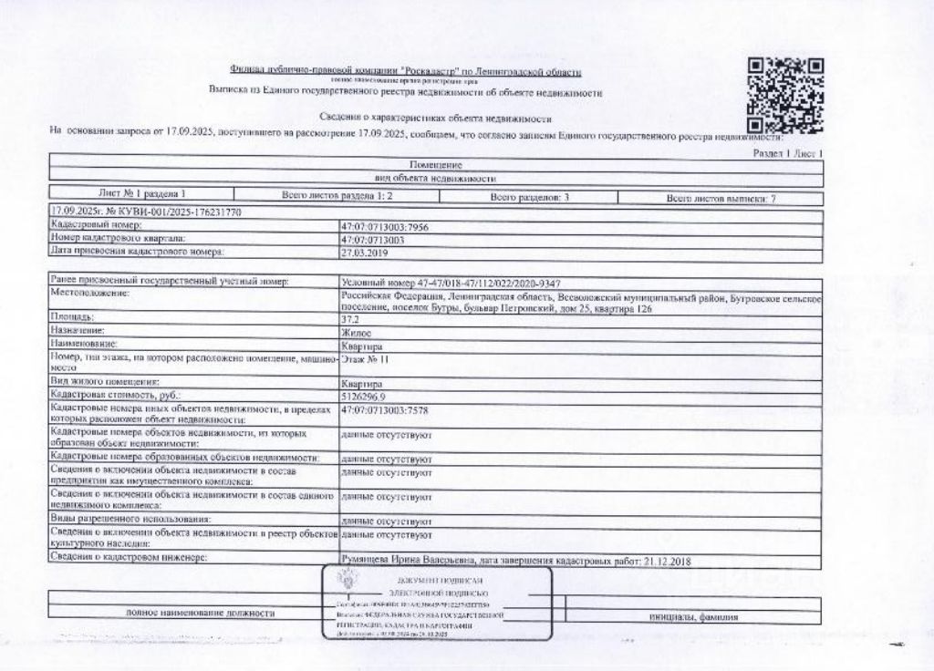 Лот6 Подвергнутое аресту Всеволожским РОСП по и/п 370951/25/47021-ИП и принадлежащее должнику Фишер И.А. заложенное имущество: квартира общ.пл. 37,2 кв.м кадастровый 47:07:0713003:7956, расположенная по адресу: ЛО, Всеволожский район, Бугровское г.п., п. Бугры, б-р Петровский, д. 25, кв. 126. Форма 7, Форма 9 от 24.10.2025, в квартире зарегистрировано 3 человека, в том числе 1 несовершеннолетний. Сведения о задолженности по взносам на капитальный ремонт судебным приставом-исполнителем не представлены