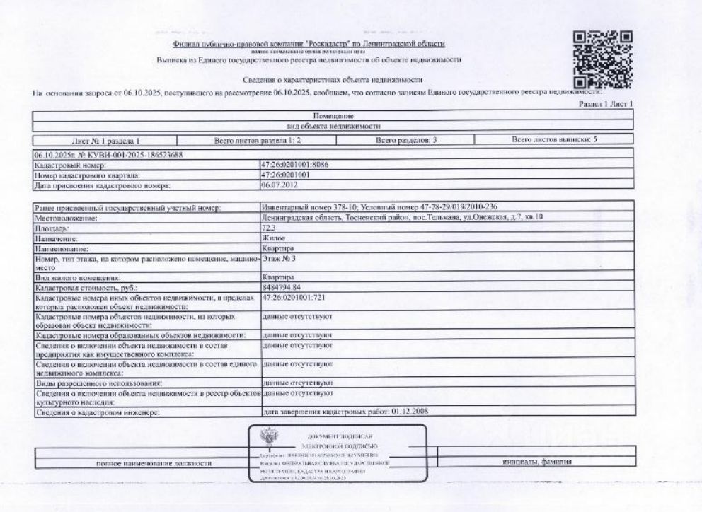 Лот10 Подвергнутое аресту Тосненским РОСП по и/п 360637/25/47035-ИП и принадлежащее должнику Махмудовой С.Р. заложенное имущество: квартира общ.пл. 72,3 кв.м. кадастровый 47:26:0201001:8086, расположенная по адресу: ЛО, Тосненский район, пос. Тельмана, ул. Онежская, д. 7, кв. 10