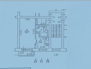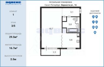 Планировка: жилая комната 16,7 кв.м., кухня 5,6 кв.м., совмещенный санузел 3,8 кв.м., прихожая 3,1 кв.м., гардеробная зона.