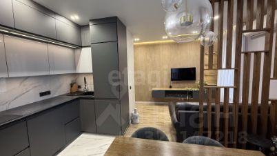 - кухню-гостиную зонально разделенную с искусственным камином, для создания теплой атмосферы при дружеских и семейных посиделках. Установлен кондиционер.