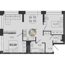 Квартира находится на 4/22 этаже. Общая площадь квартиры 63.20 м2.