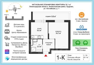 общая площадь квартиры - 32,1 кв.м. + застекленная лоджия 8,8 кв.м,