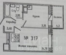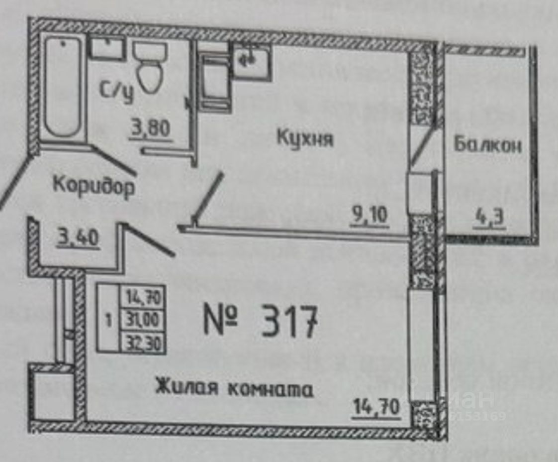 Площадь комнаты - 14.7, Площадь кухни - 9.1