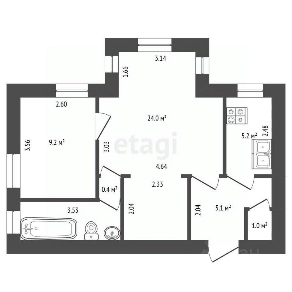 Планировка включает две смежные комнаты 24 и 9,2 м², кухню 5,2 м²,