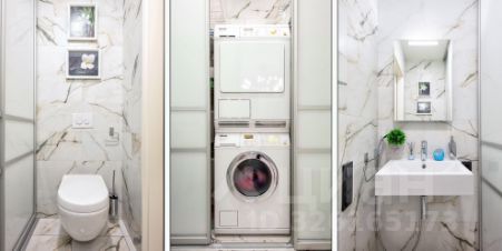 Гостевой туалет совмещен с хозблоком: установлена стиральная и сушильная машины MIELE, предусмотрены места хранения инвентаря для уборки.
