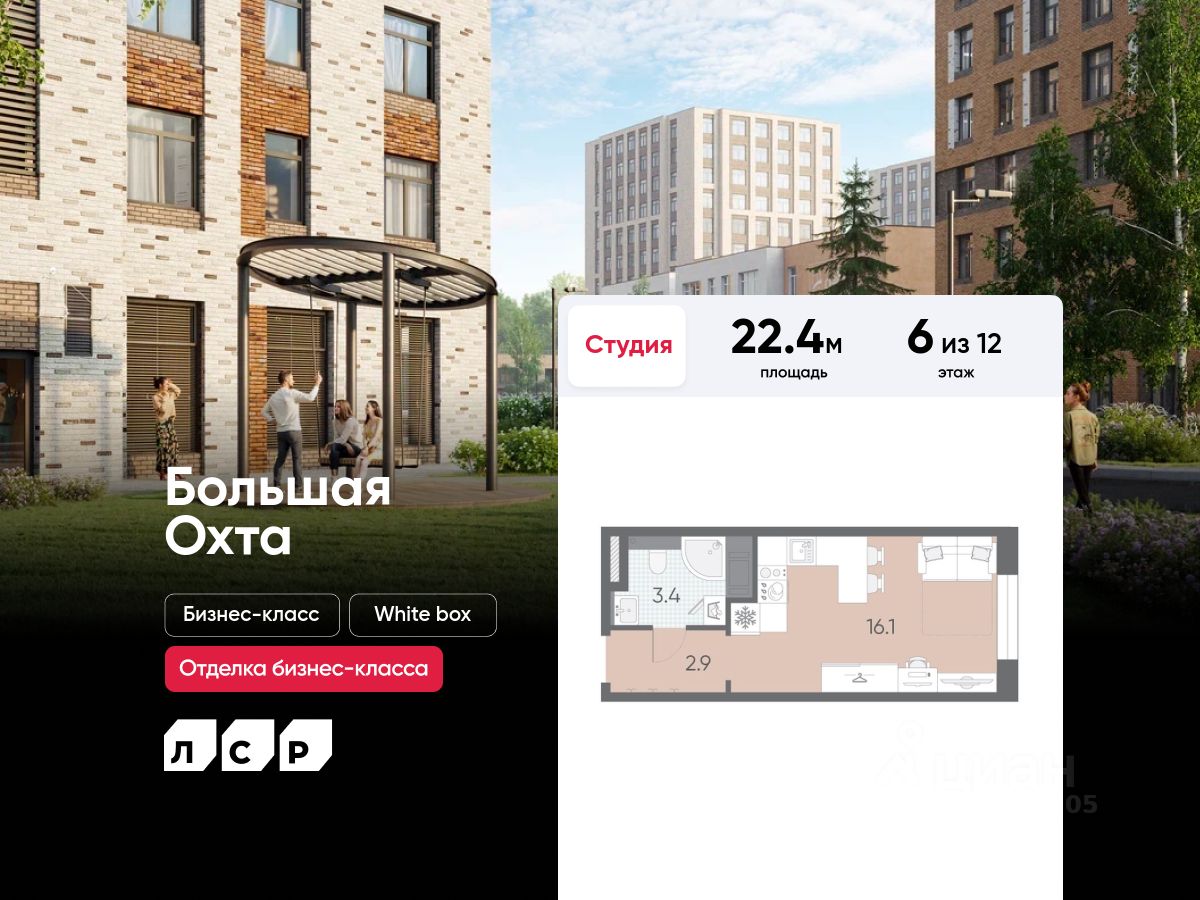 Продаётся студия в ЖК "Большая Охта" на 6 этаже. Общая площадь составляет 22.40 кв. м. Квартира с white box отделкой. Жилой комплекс "Большая Охта" располагается по адресу Санкт-Петербург, Красногвардейский.