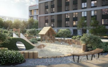 Двор разделен на тематические зоны: для детей, подростков и взрослых. Детская игровая зона удалена от мест для релаксации и находится на своеобразном подиуме.