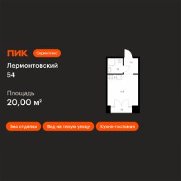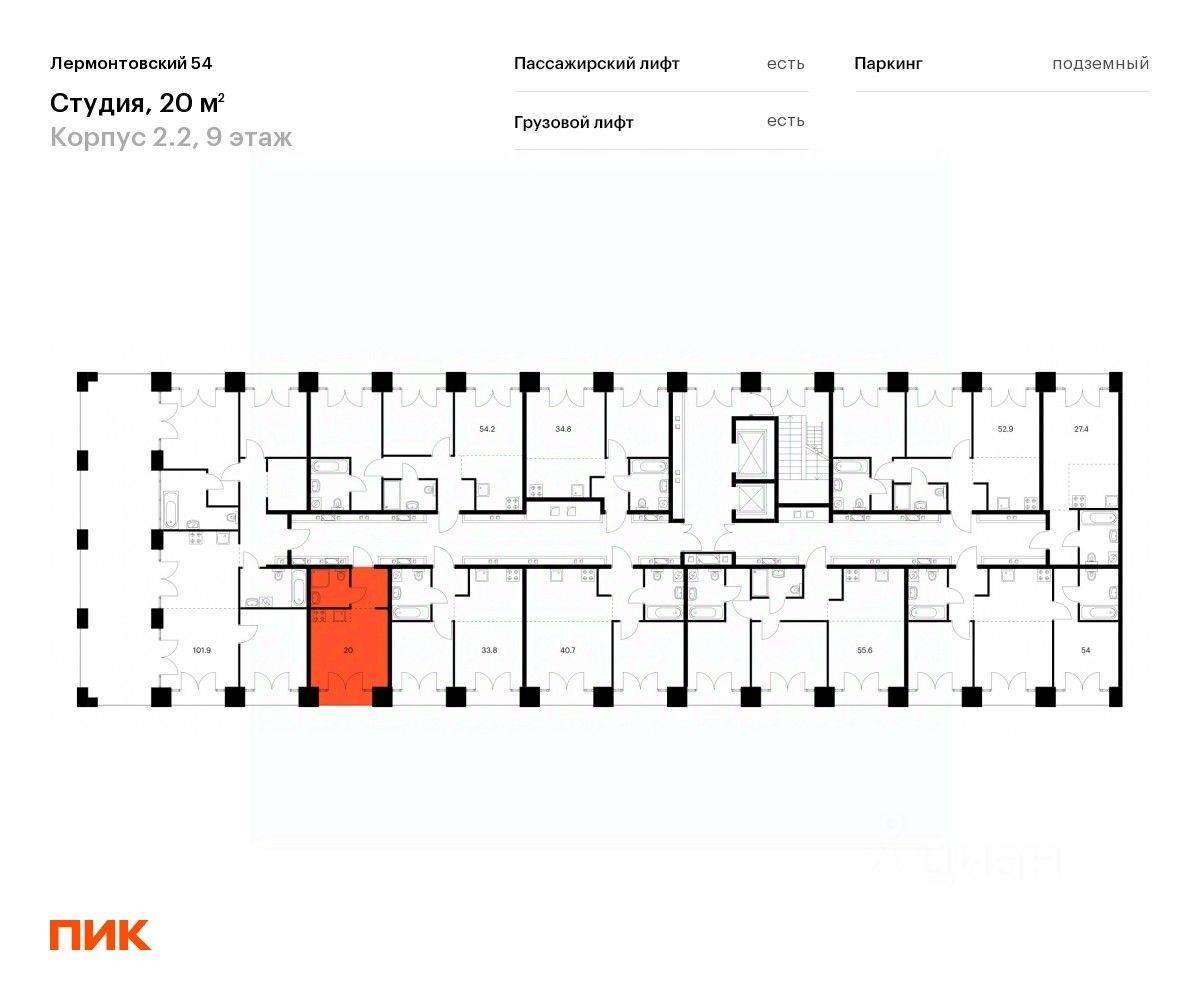 Продаётся квартира-студия площадью 20 кв.м на 9 этаже 9 этажного дома (Корпус 2.2, Секция 13) проекта ПИК Лермонтовский 54. Светлый просторный подъезд на уровне земли, функциональная планировка, большие окна, без отделки.