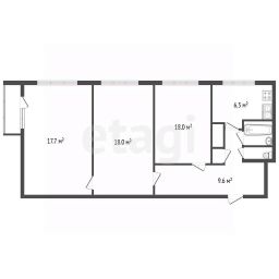 Планировка квартиры: три изолированные комнаты, раздельный санузел и балкон. Окна выходят во двор.
