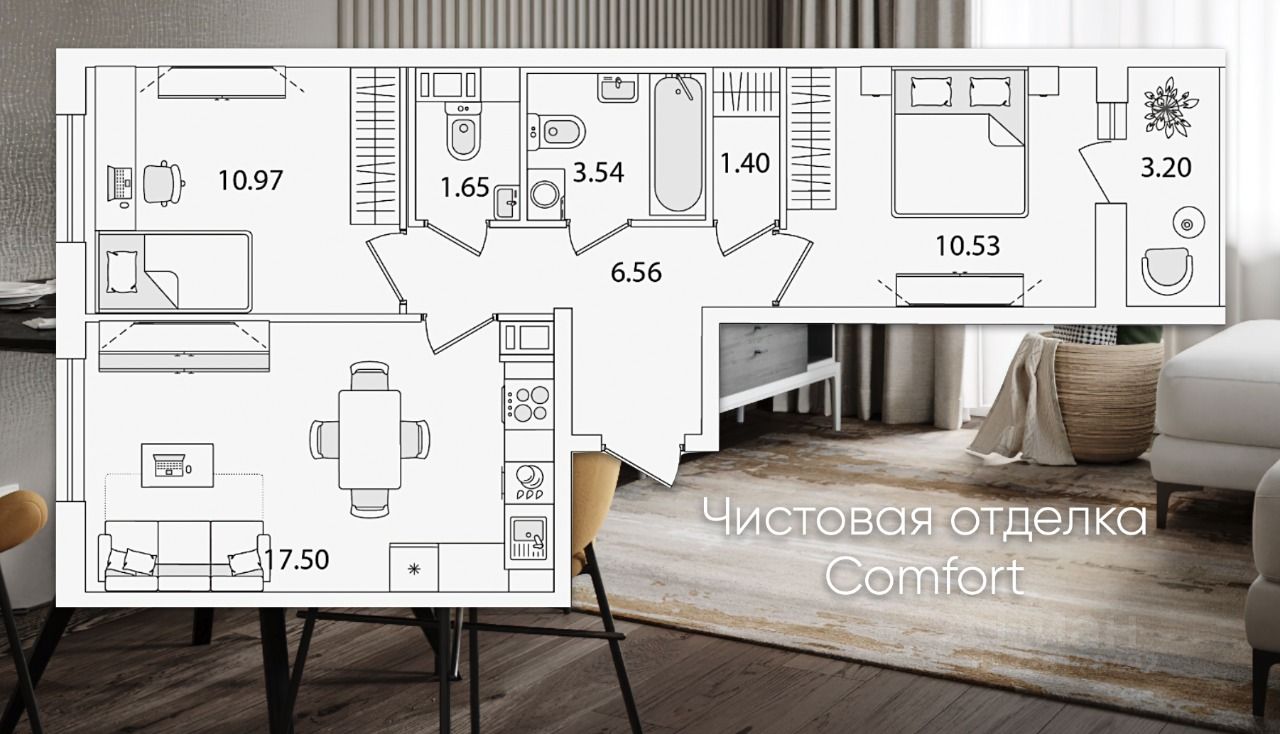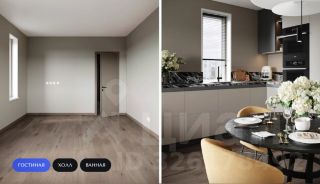 Полная чистовая отделка Comfort Dark выполнена в контрастных тонах (ламинат, двери, плинтусы). Отделка санузлов: сочетание темных тонов с нейтральными оттенками серого цвета.
