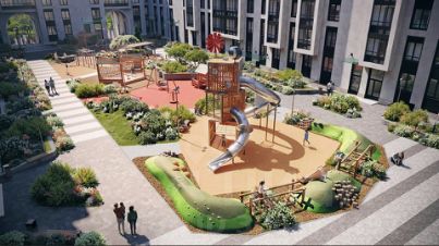 На территории комплекса имеются спортивные и детские площадки, разделенные по возрастам, а также места для отдыха. Зонирование создано с помощью озеленения, дорожек, подпорных стен и геопластики. В проекте предусмотрен детский садик и школа, подземный паркинг и кладовые на -1 этаже, а также система контроля доступа и видеонаблюдение.