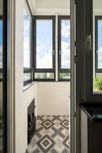 Теплая лоджия с мягким креслом, подставкой под ноги, подсветкой и электрокамином — ваше личное место для отдыха с видом на крыши Петербурга.