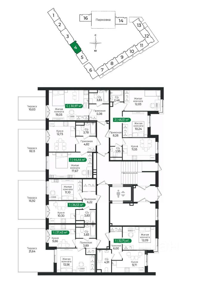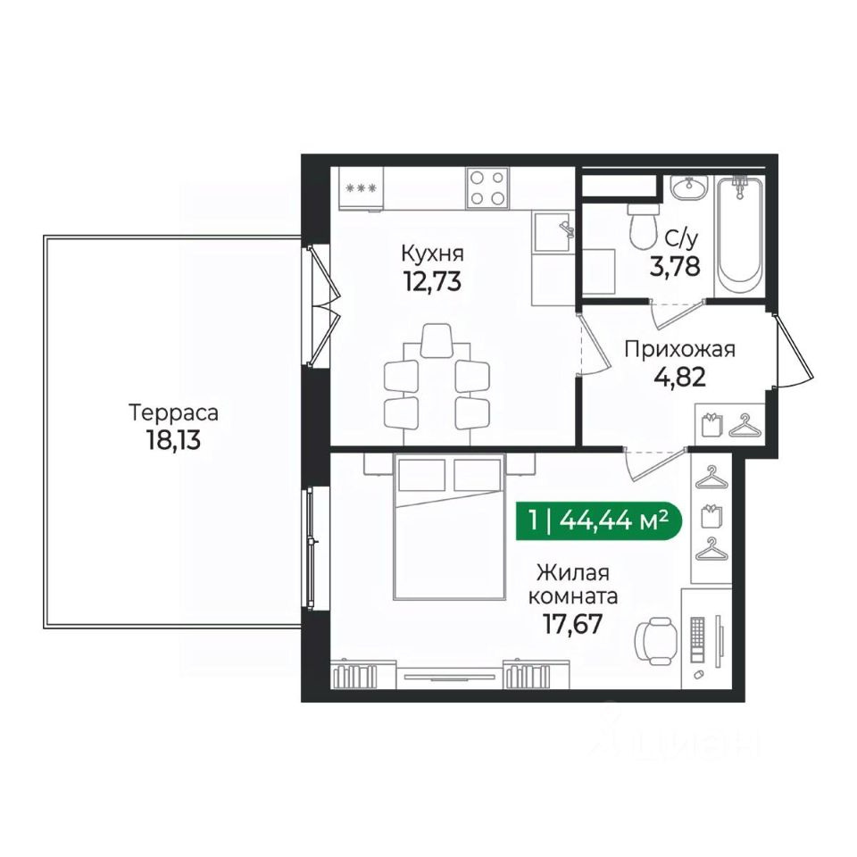 1 - комнатная с летней террасой квартира на 1 этаже общей площадью 44,44 м² в IV очереди в жилом комплексе Сертолово Парк от застройщика ГК Алгоритм.