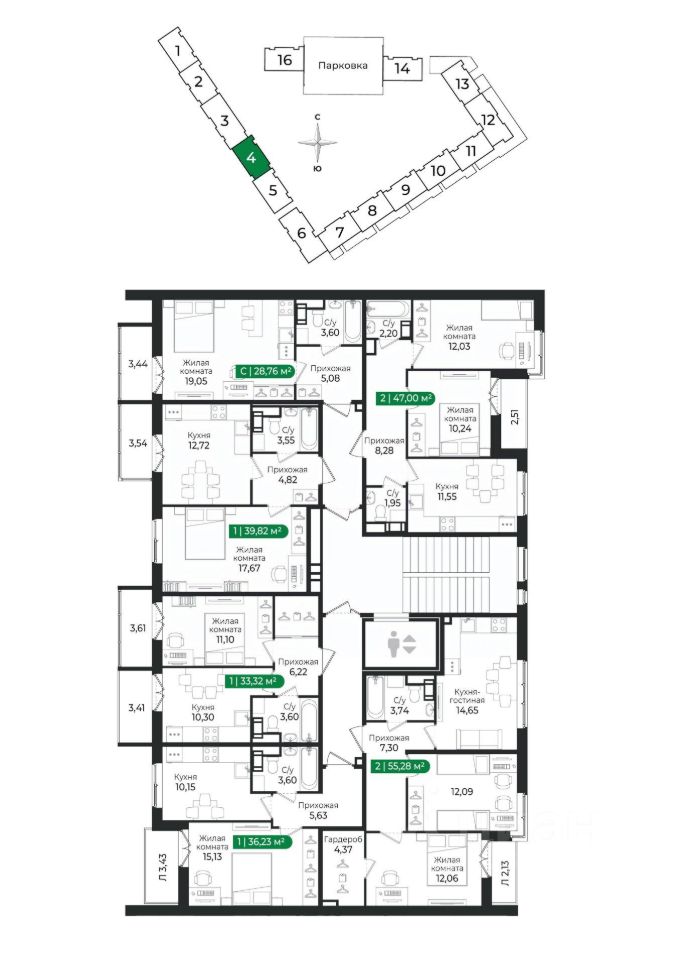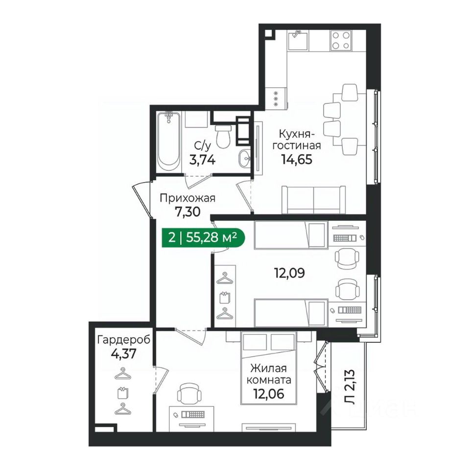 2 - комнатная квартира на 8 этаже общей площадью 55,28 м² в IV очереди в жилом комплексе Сертолово Парк от застройщика ГК Алгоритм.