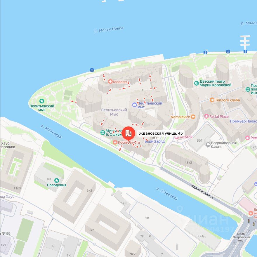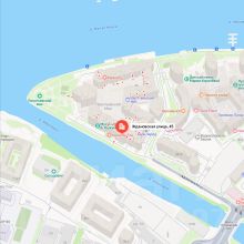 Расположение. Комплекс находится на мысу, омываемом реками Ждановкой и Малой Невкой, в 5 минутах от Крестовского острова и в 8 минутах от Невского проспекта. Это обеспечивает сочетание панорамных видов, свежего воздуха и приватности в центре города.
