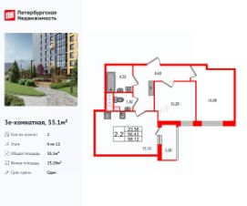 Удобная, классическая, функциональная европланировка, большая кухня-гостиная 17.13 м², просторная прихожая 9.4 м². Общая площадь квартиры - 55.1 м², жилая 23.29 м², высота потолка 2.77 м.