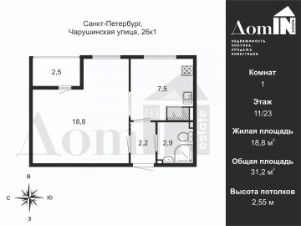 Общая площадь квартиры - 31,2 м, жилая 18,8 м, кухня 7,5 м. Вид из окна - НЕ на КАД! Во двор.